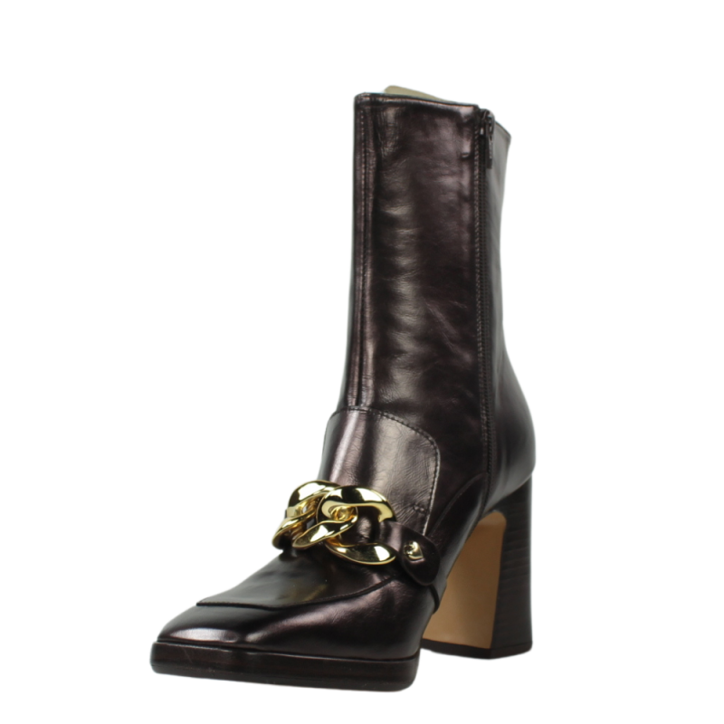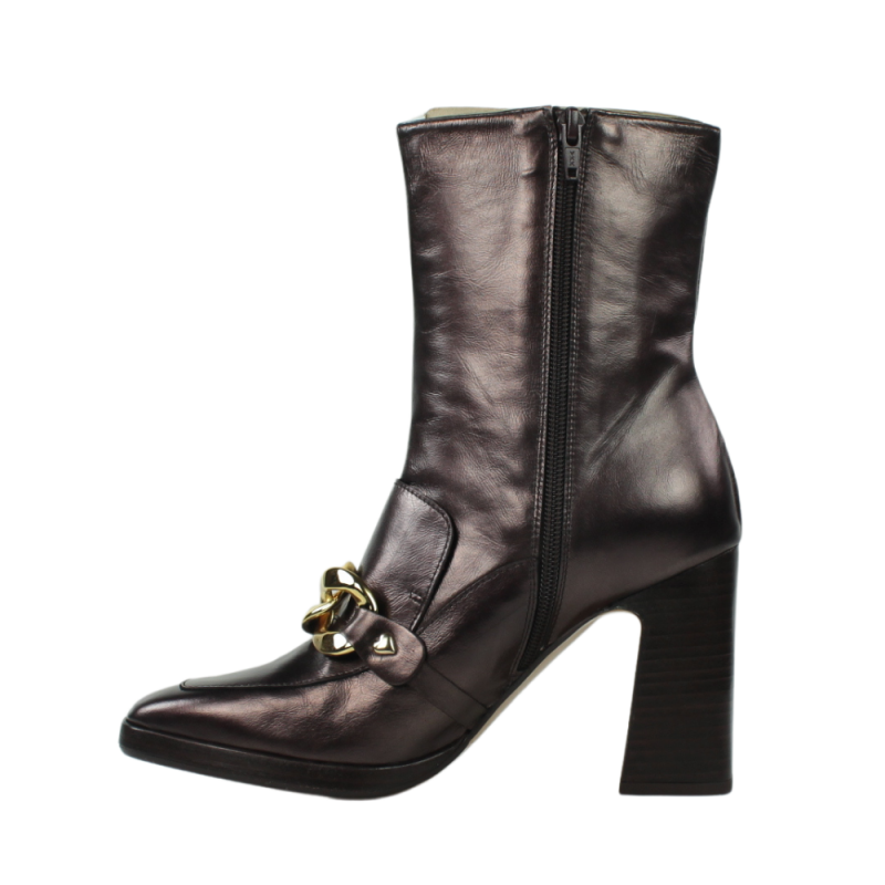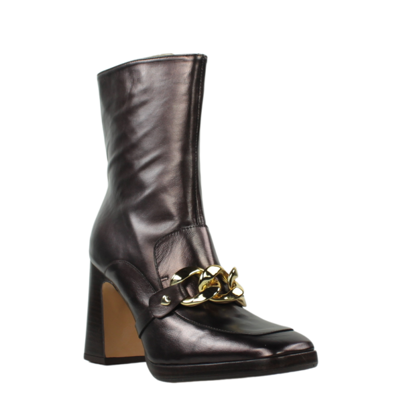 Botines LODI en piel de alta calidad metalizada color bronce con un diseño excepcional elegante, puntera delantera cuadrada y modelo decorado con una cadena dorada, con cremallera, tacón con una pequeña plataforma delantera.