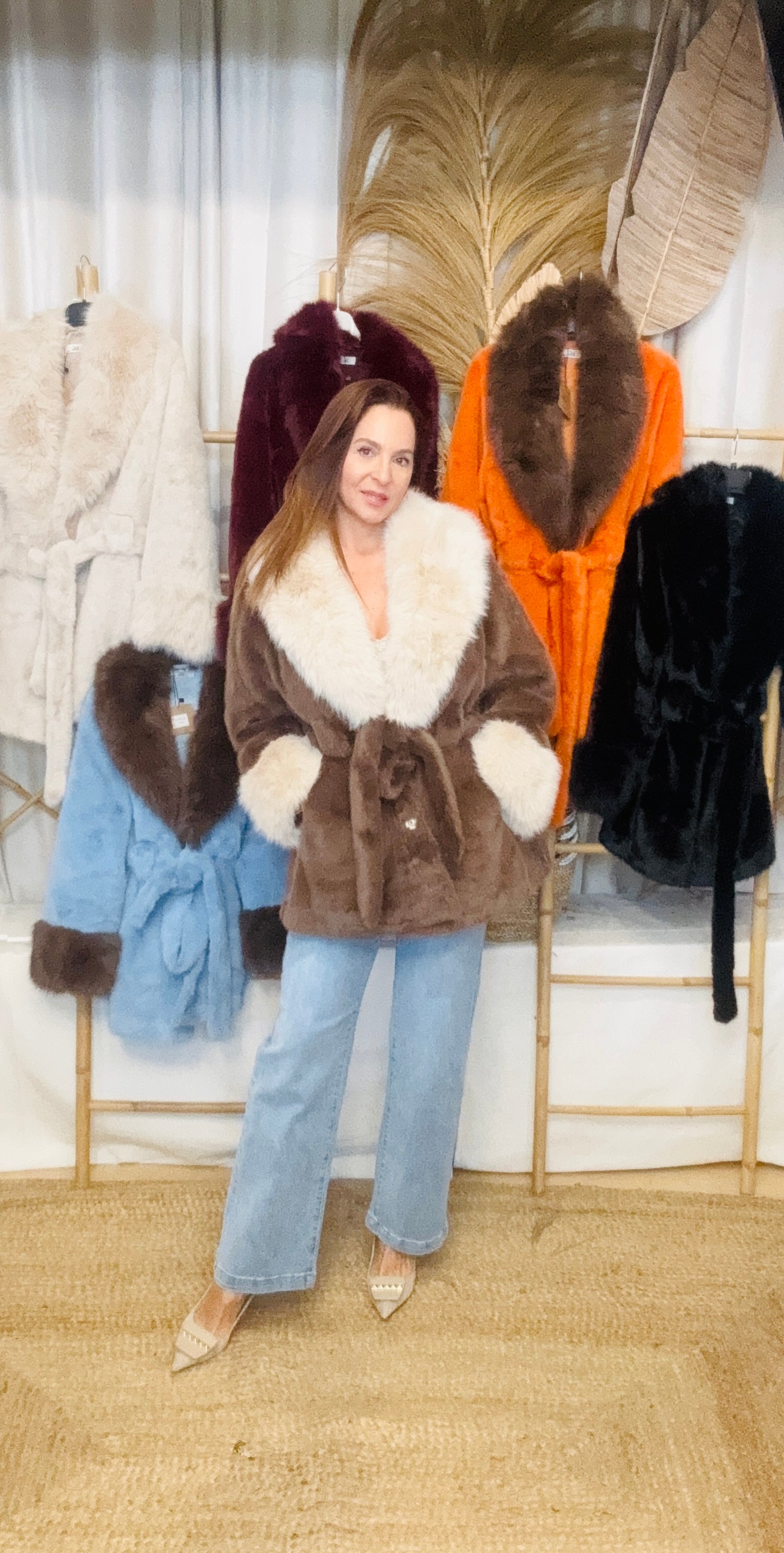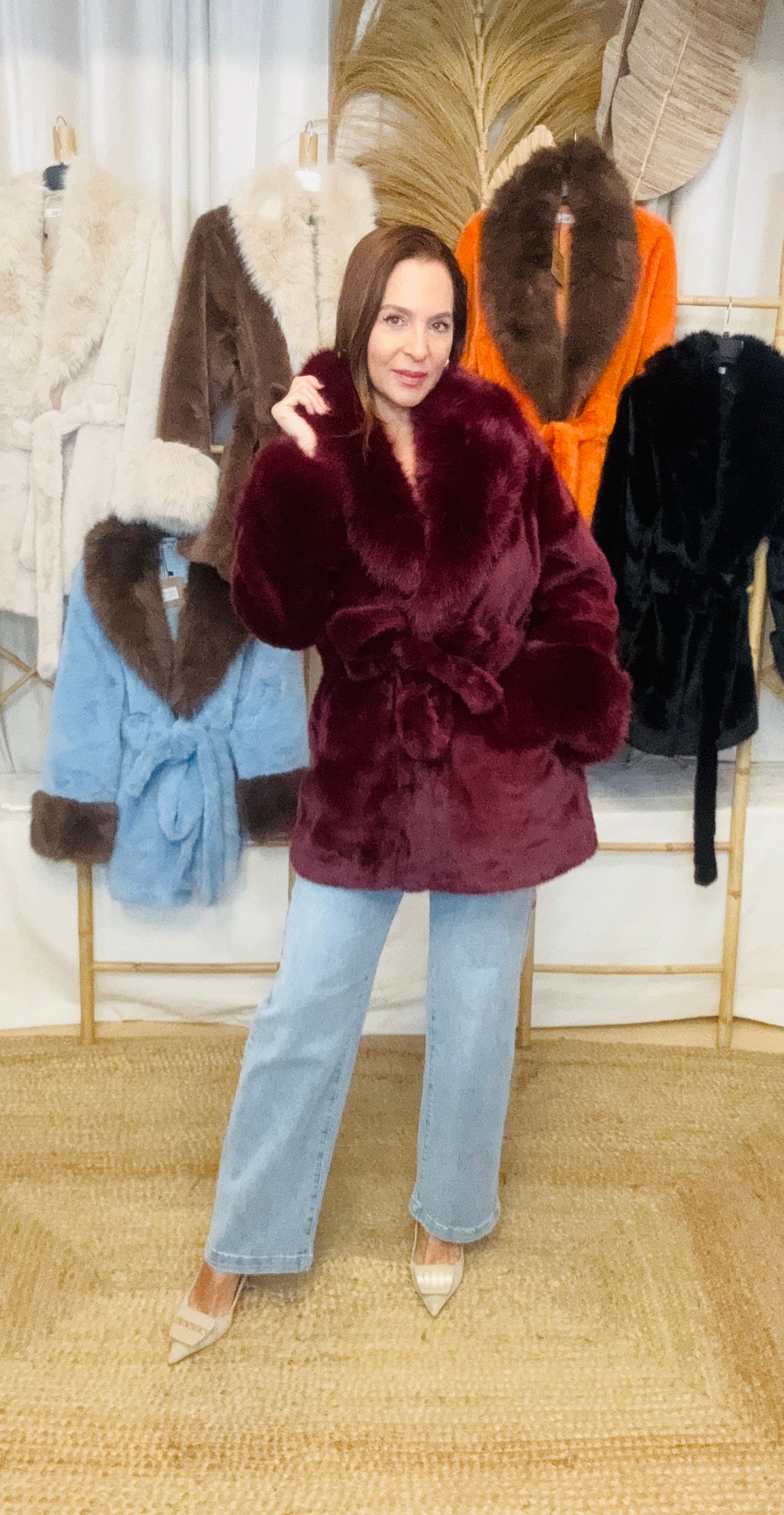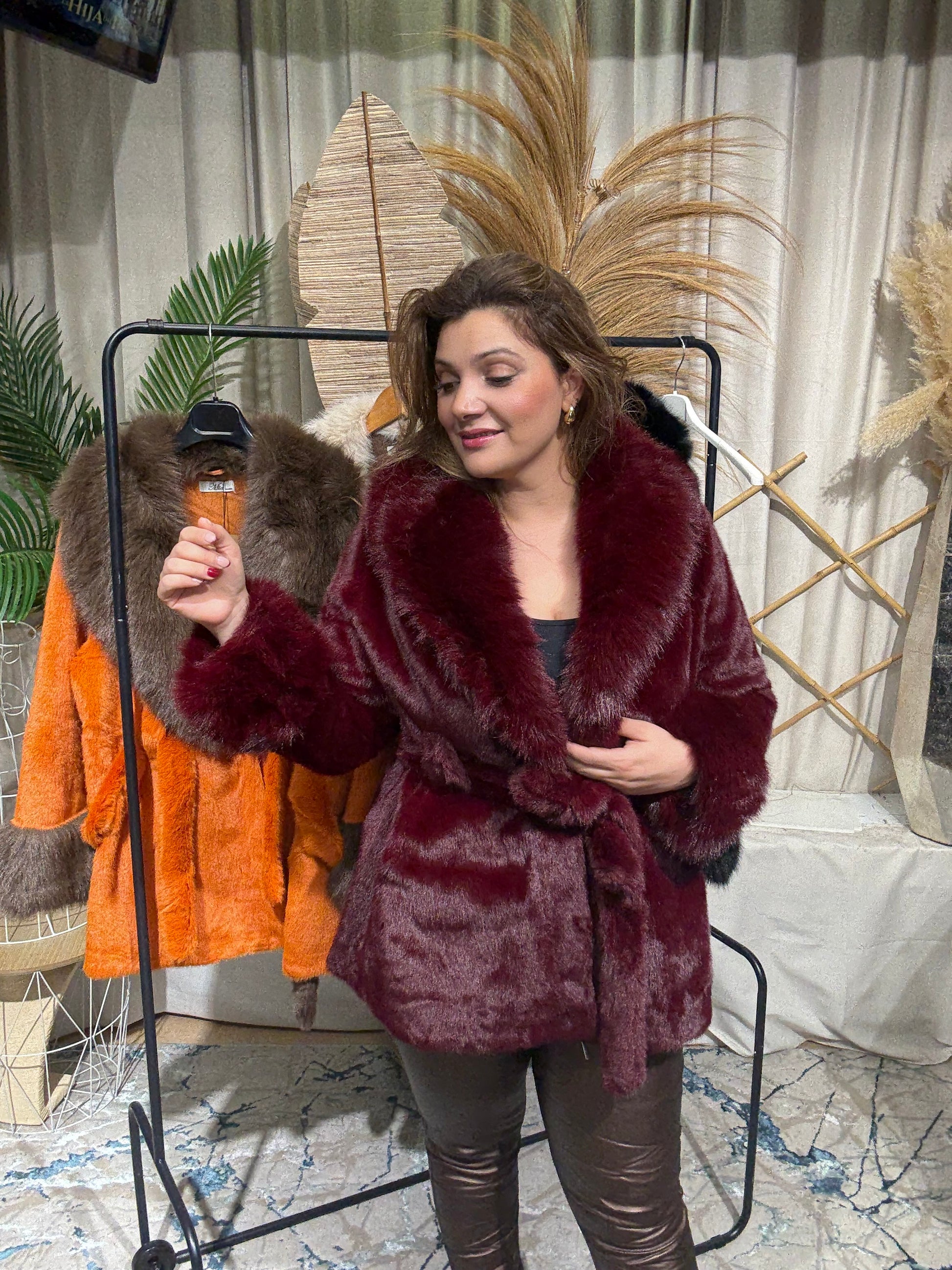 Abrigo de pelo sintético con un tejido muy agradable y suave con detalle cinturón.