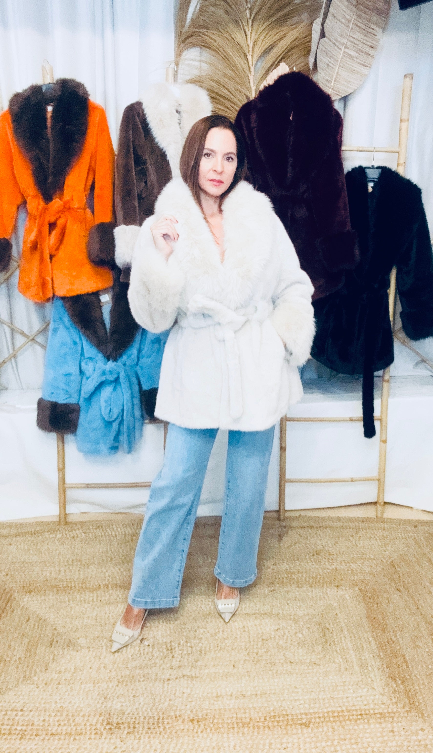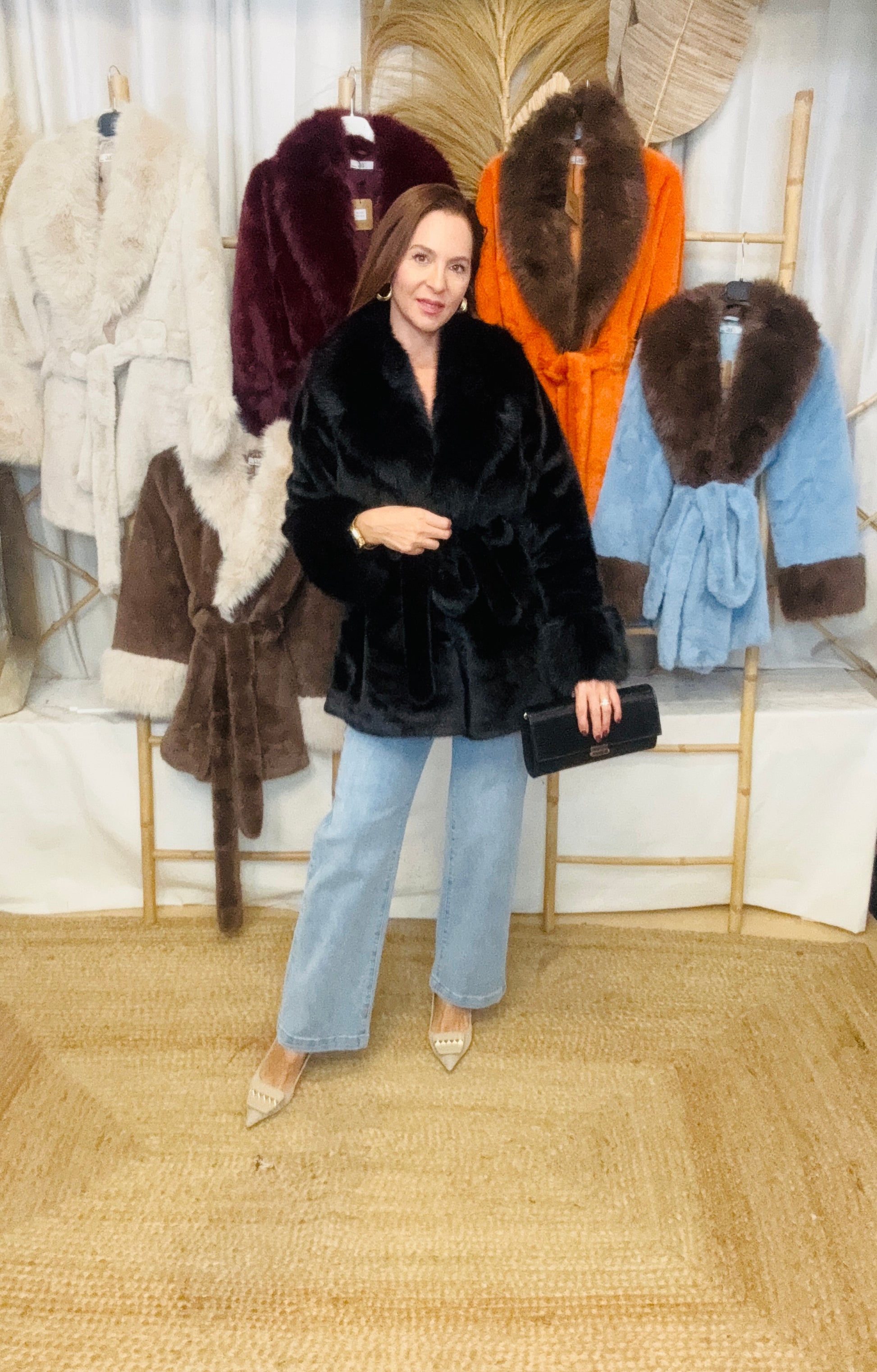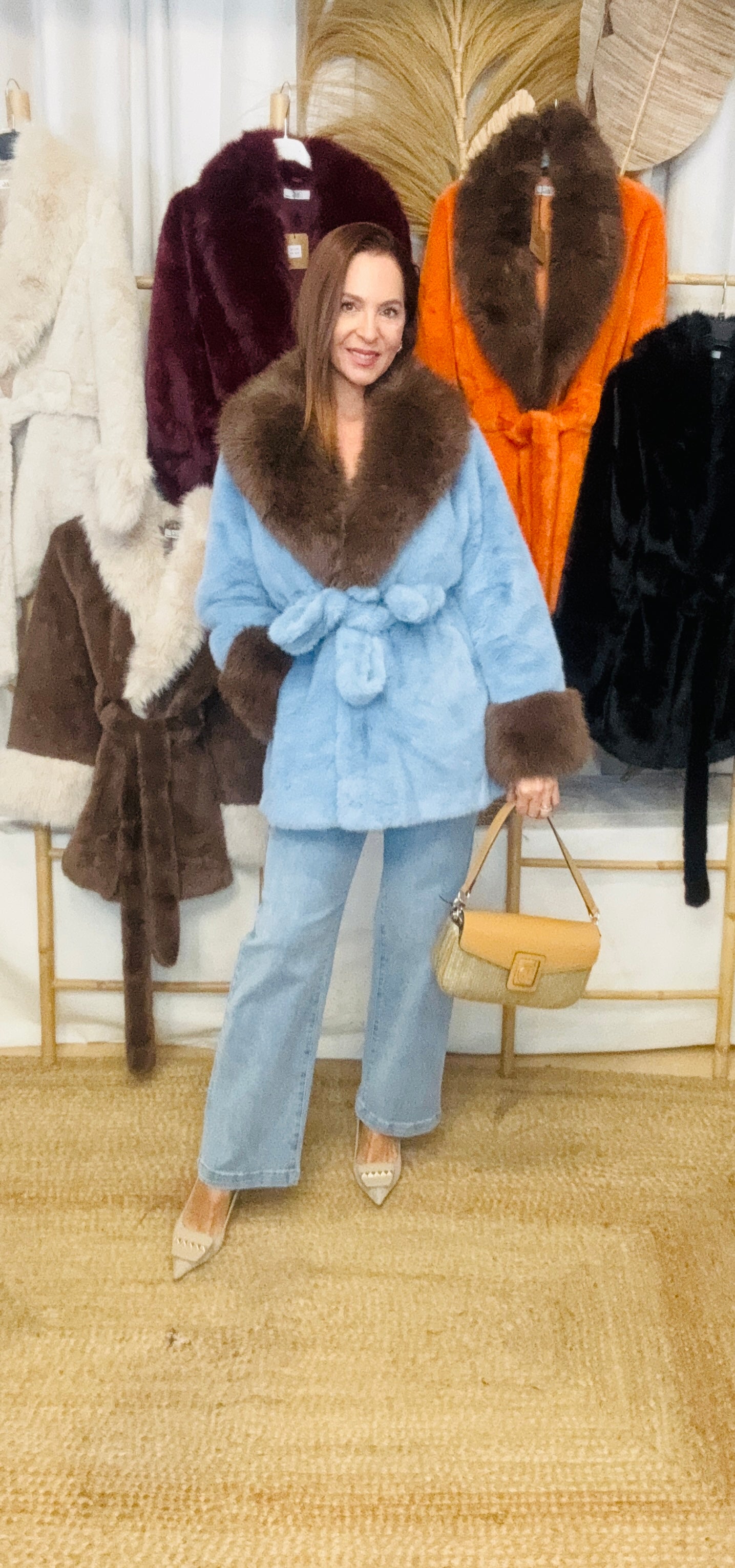 Abrigo de pelo sintético con un tejido muy agradable y suave con detalle cinturón.