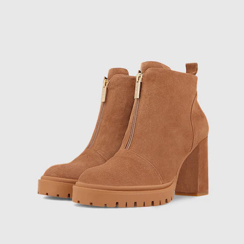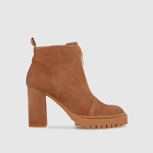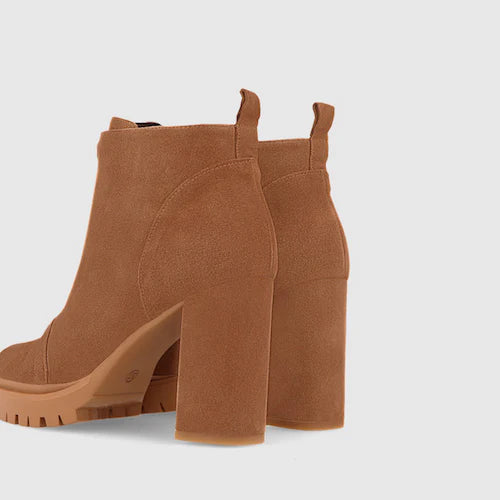 Botines de tacón alto y plataforma de la marca Lodi. Fabricado en piel serraje color camel. Cierre mediante cremallera sobre el empeine. Tacón bloque forrado al tono. Destaca tirador trasero al tono. Interior en piel. Incluye planta new gel para mayor comodidad en todas tus pisadas.