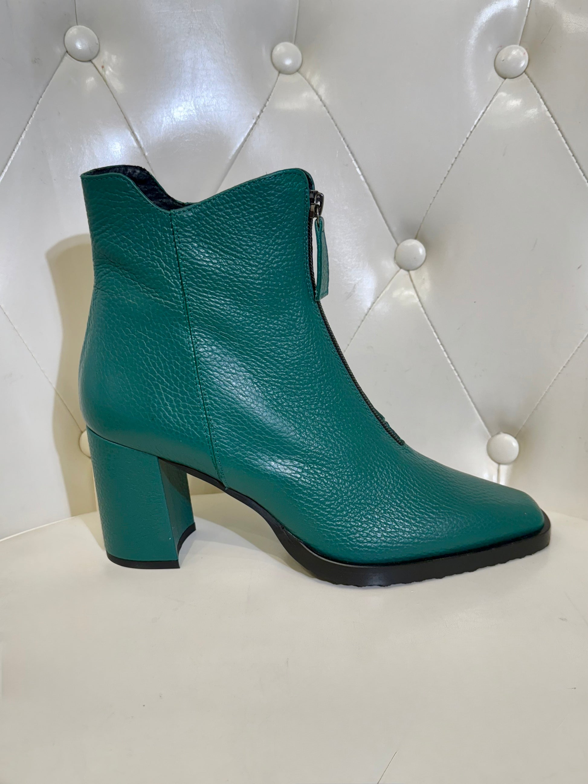 Botín firma Doralatina en piel, color verde esmeralda, con cremallera en la parte frontal, fabricado en España.