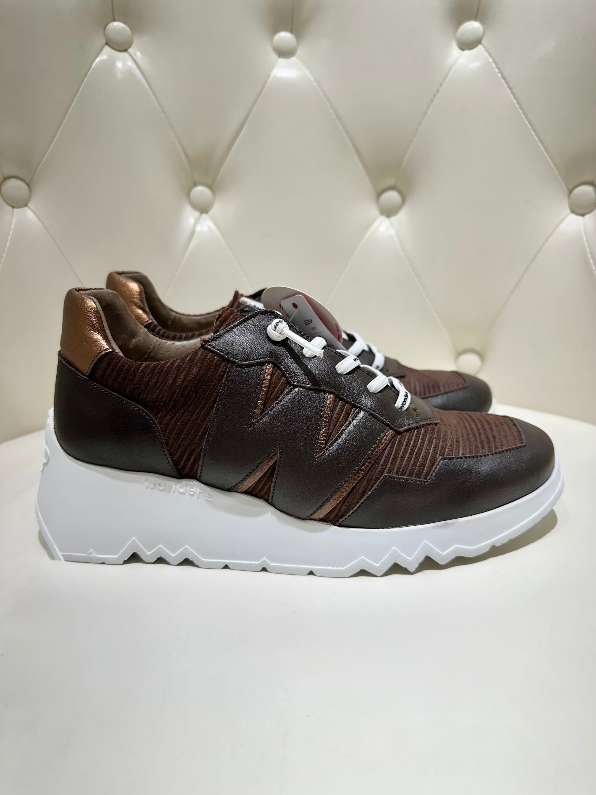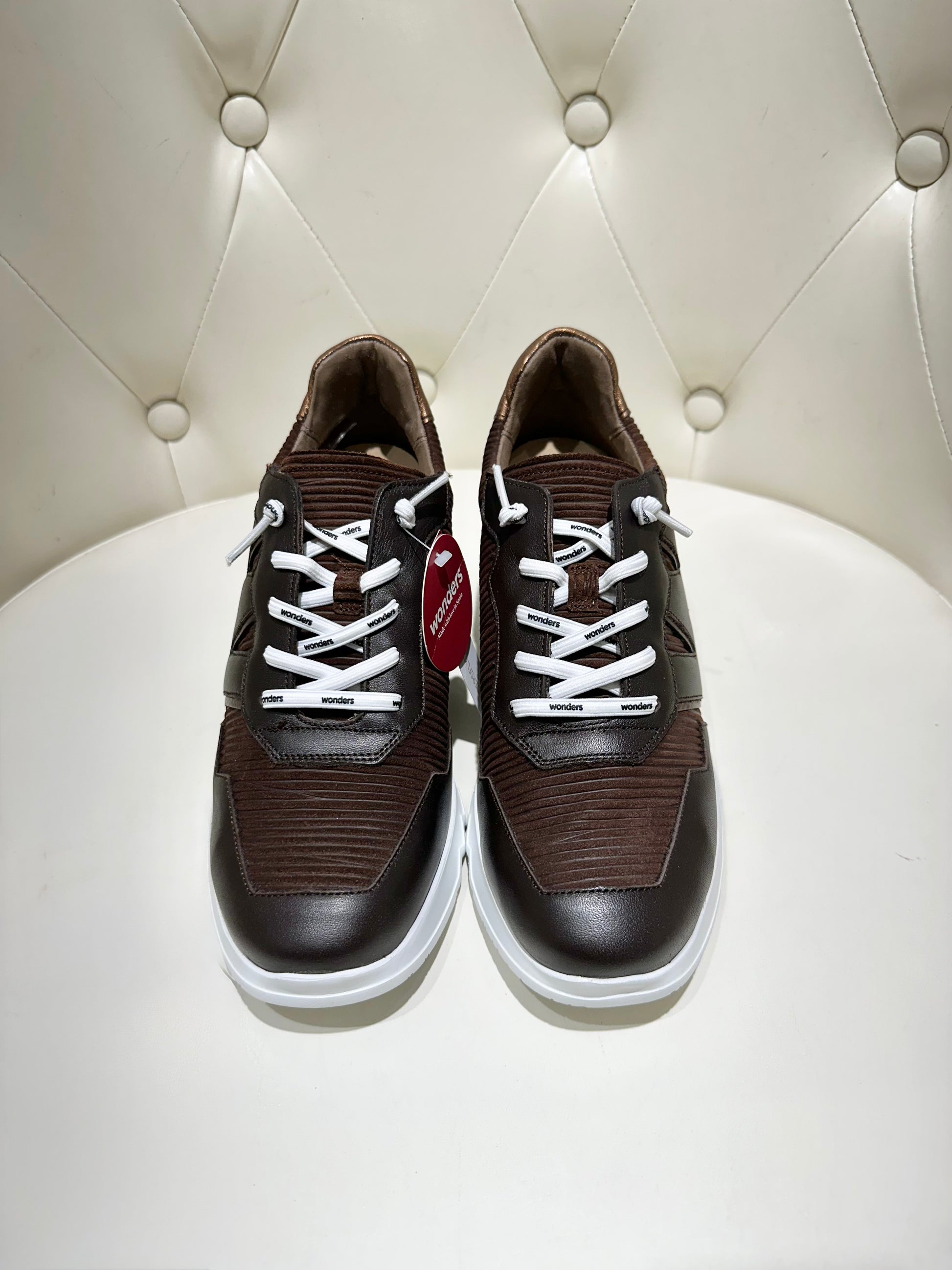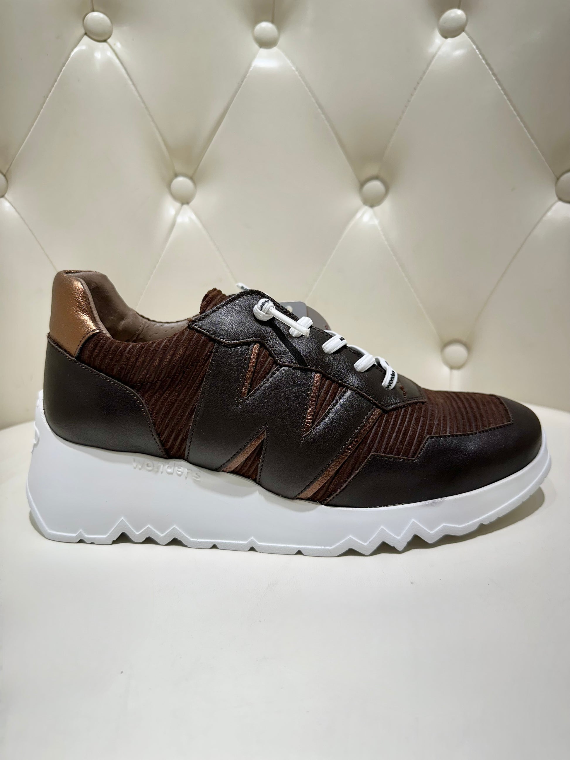 Zapatillas deportivas de estilo casual de la marca WONDERS para mujer. Diseño moderno que combina piel y nylon. Cierre con cordones elásticos. Plataforma de 3,5 cm de altura. Tecnología Wondersfly que aporta ligereza, flexibilidad, resistencia. Plantilla de comfort, ergonómica. Eco Friendly. Fabricadas en España.